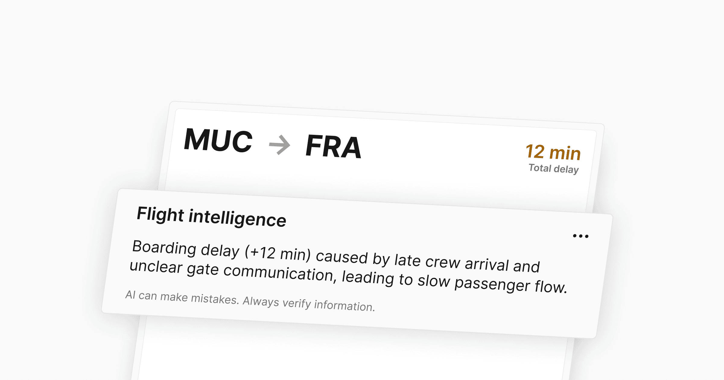 Introducing Flight Intelligence, your AI-generated operational summary of flight events. Flight Intelligence analyzes all available flight data — schedule, delay codes, incidents, turnaround feedback, and recent activities — and produces a concise summary of what happened and why.